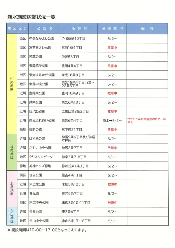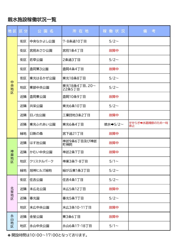 故障等により稼働を停止している親水施設もございます、ご理解ご協力をお願い申し上げます。