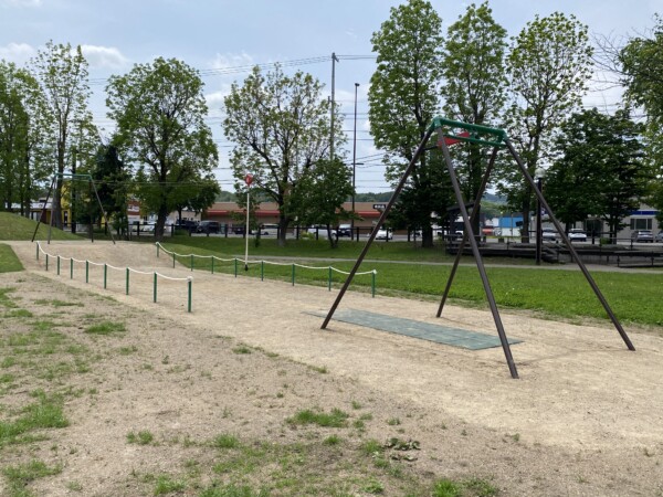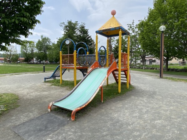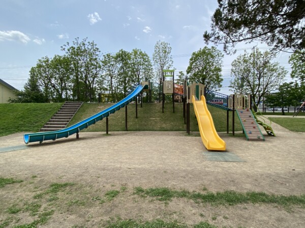 トイレのそばに噴水(現在故障中のため稼働できていません)や幼児用の複合遊具、丘の上に設置されたダイナミックな遊具には、青を黄色の滑り台があり、横には大きなターザンロープが設置されています。