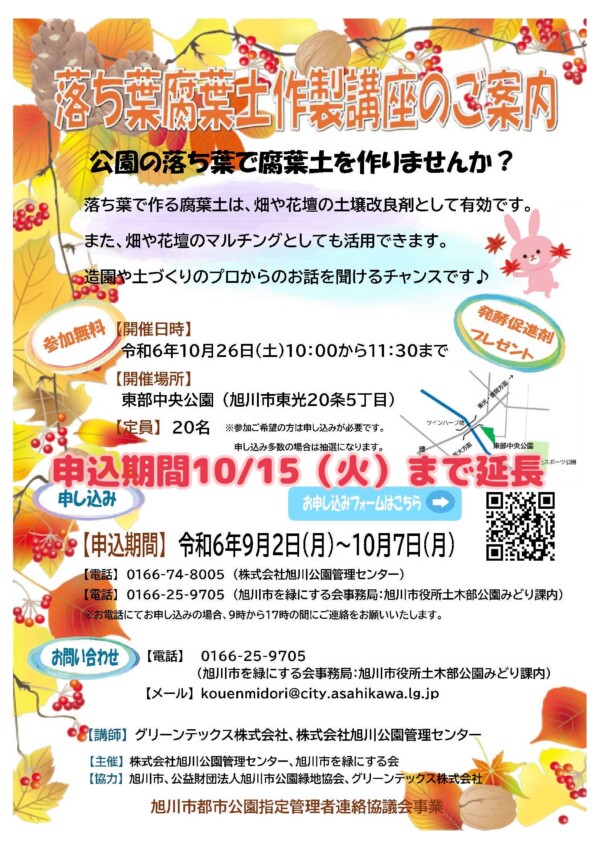 お知らせ 2024年10月08日(火) 落ち葉腐葉土作製講座 申込期間延長 落ち葉腐葉土作製講座の申込期間を9月2日(月)から10月7日(月)までとしておりましたが、 10月15日(火)まで延長いたします。 腐葉土づくりに興味がある方はぜひご参加ください。
